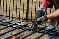 For the remaining fence spaces that are too narrow for mounting a full panel, measure the distance between posts, inside face to inside face. Subtract 1/2 inch, and the remainder is the length to cut the partial panel. Place the panel on a sturdy surface, clamp it securely, and have a helper hold the panel down to minimize the vibration while cutting. You can use a hacksaw, but we used a Sawzall with a metal-cutting blade to trim the panels. Make sure the rails extend equally from the last picket at both ends of the panel. After cutting, drill new 5/16-inch bolt holes about 3/4 inch from the end of each panel rail. Remove any burrs and then mount into the brackets as usual. At the areas where you cut, apply a coat of zinc-rich primer, and then after it dries, spray on a color-matching topcoat.