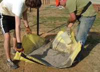 To mix the concrete, we used a plastic CreteSheet, which is basically a wide, thick plastic sheet with four handles. To use, just pour in the concrete mix and add water according to the mix instructions. Our mix required one gallon of water for every 80 pounds of concrete. After adding the water, grab the sheet by two of the handles and have a helper do the same on the opposite side. As the two of you lift the sheet and roll the mix and water back and forth, the concrete blends to a cookie-dough consistency. Then tilt the sheet to pour the mud. We used an 80-pound bag per post. This being our first time using the CreteSheet, I had my doubts about this mixing method, but I am now convinced. When working with a helper, the sheet method is much faster, easier and more effective than mixing concrete in a wheel-barrel with a shovel.